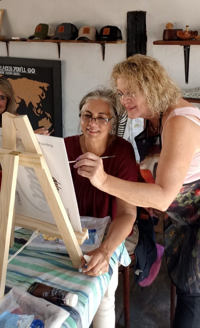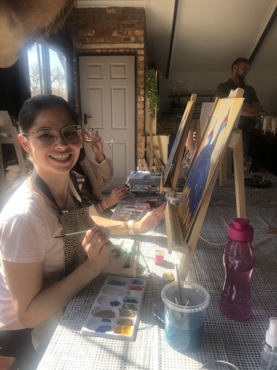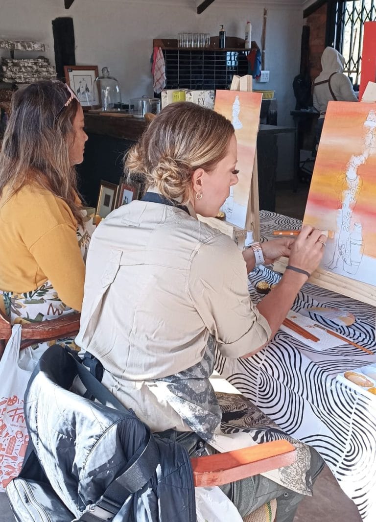 In our Paint & Sip class, featuring local wines and guided by a talented local artist, Mariana Human. Set in the heart of the bushveld at the Kartula Deli, this vibrant experience invites you to explore African-inspired art in a relaxed, fun setting, no painting experience needed!